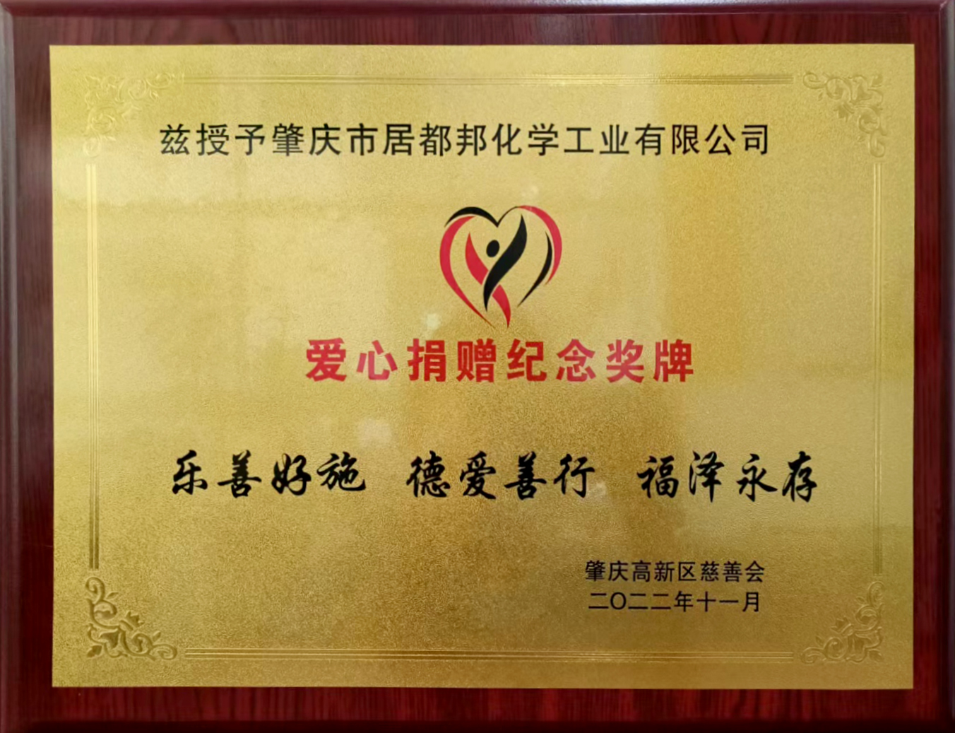 11月16日,“奉獻愛心力量,彰顯企業(yè)擔當”,肇慶市高新區(qū)愛心慈善會,為肇慶市居都邦化學工業(yè)有限公司授予《愛心捐贈紀念獎...